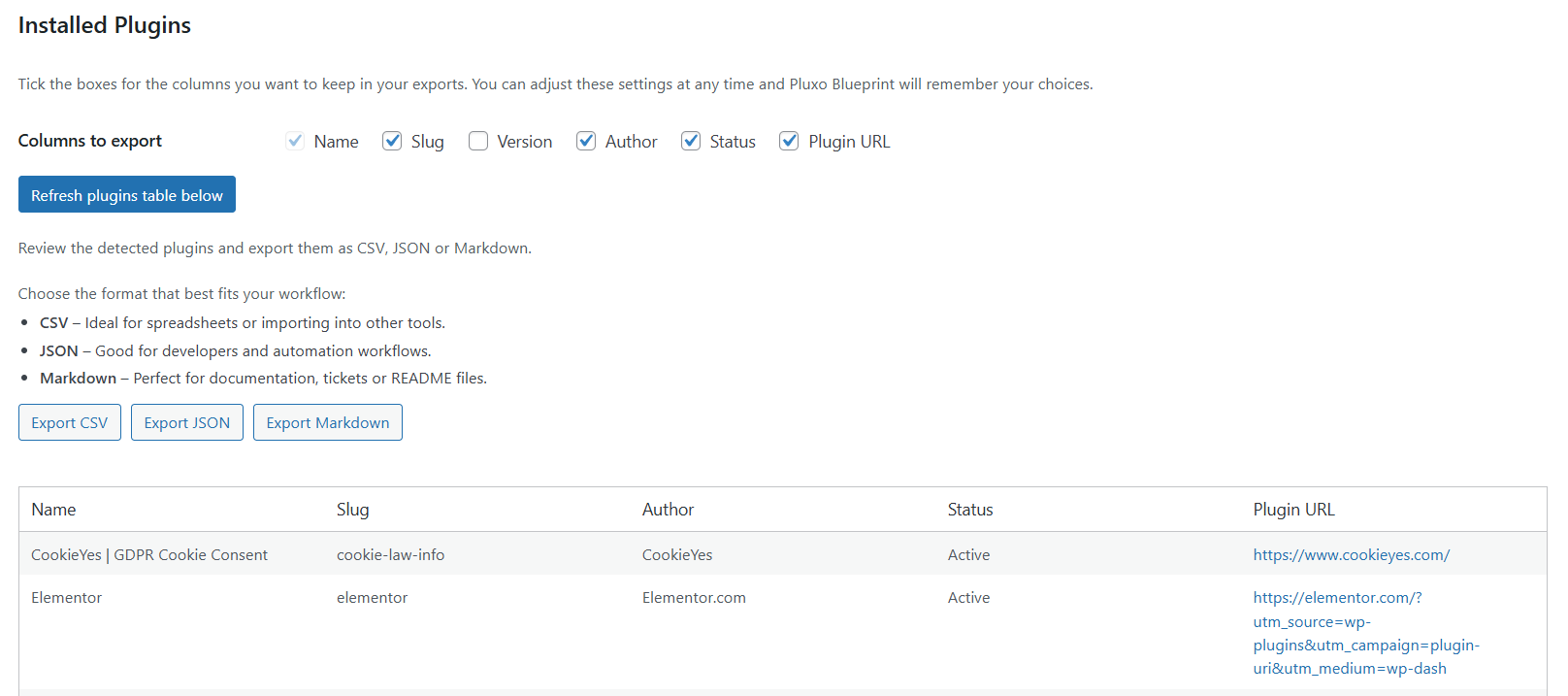 It also allows you to export your plugin inventory to CSV, JSON, or Markdown, making it easy to reuse the data for documentation or development workflows in tools like Confluence, Notion, or OneNote.