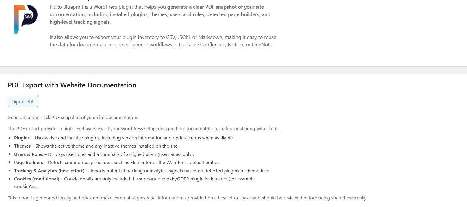 Pluxo Blueprint is a WordPress plugin that helps you generate a clear PDF snapshot of your site documentation, including installed plugins, themes, users and roles, detected page builders, and high-level tracking signals.